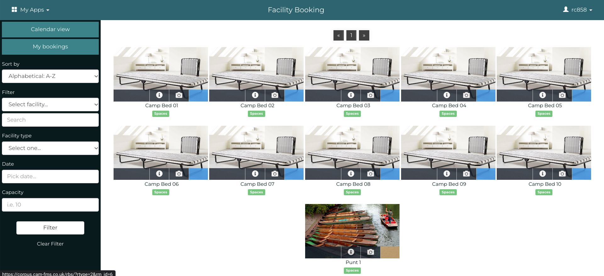 ID - The Facilities Booking page for Corpus Christi College. It lists ten camp beds, numbered Camp Bed 01 to 10 and a punt, as well a filter on the left hand side.