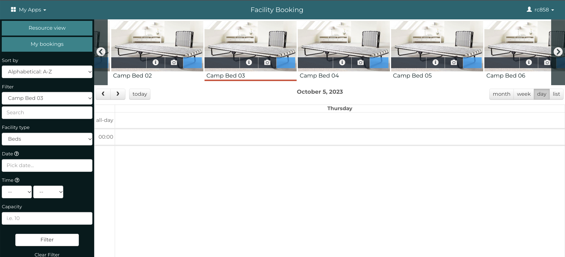 ID - The Facility Booking page for Camp Bed 03 on October 5, 2023. There are two slots for the bookings all-day or 00:00.